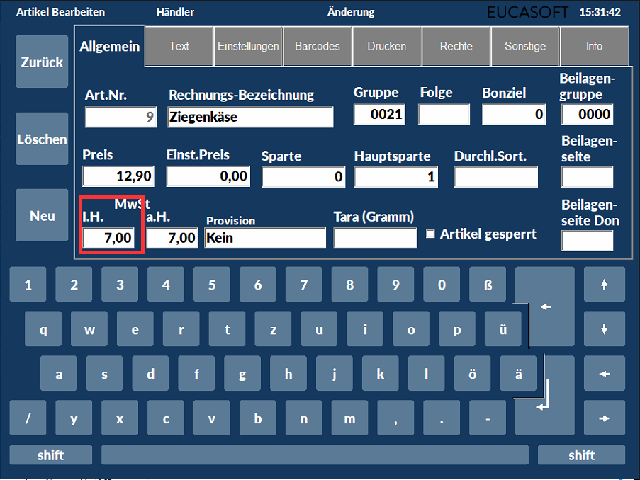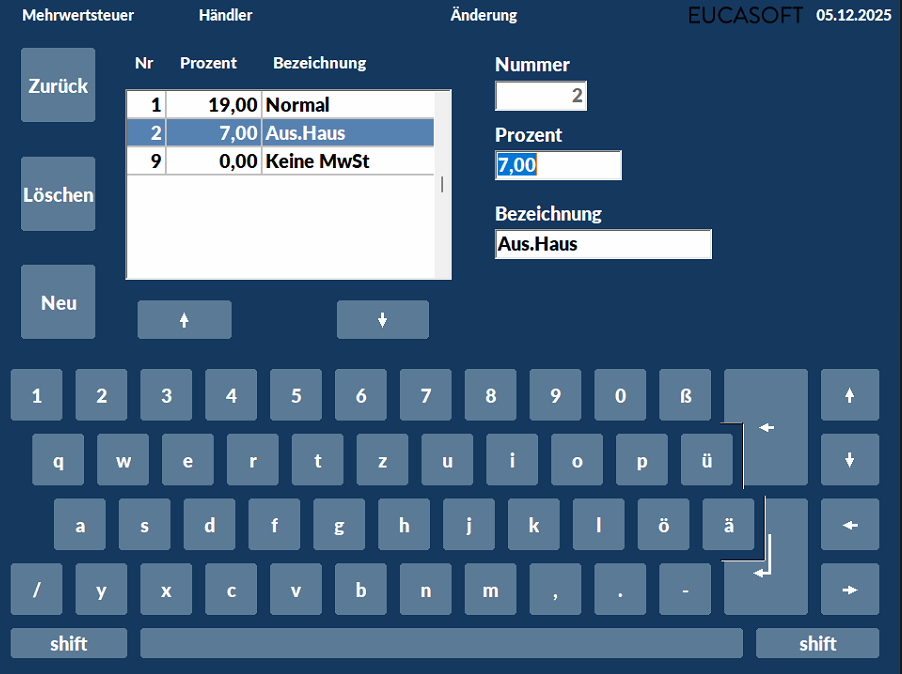 3. kontrollieren Sie zunächst ob die Mehrwertsteuer richtig hinterlegt ist, Sie sollten die 19% MwSt meist mit "Normal" bezeichnet und die 7% MwSt meist mit "Aus.Haus" bezeichnet, sehen.