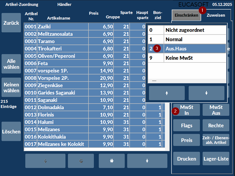7. tippen Sie dann rechts oben auf dem Reiter "Zuweisen" und dann auf dem Knopf [MwSt In] und wählen dann die MwSt Art "Aus.Haus" welche für 7% steht